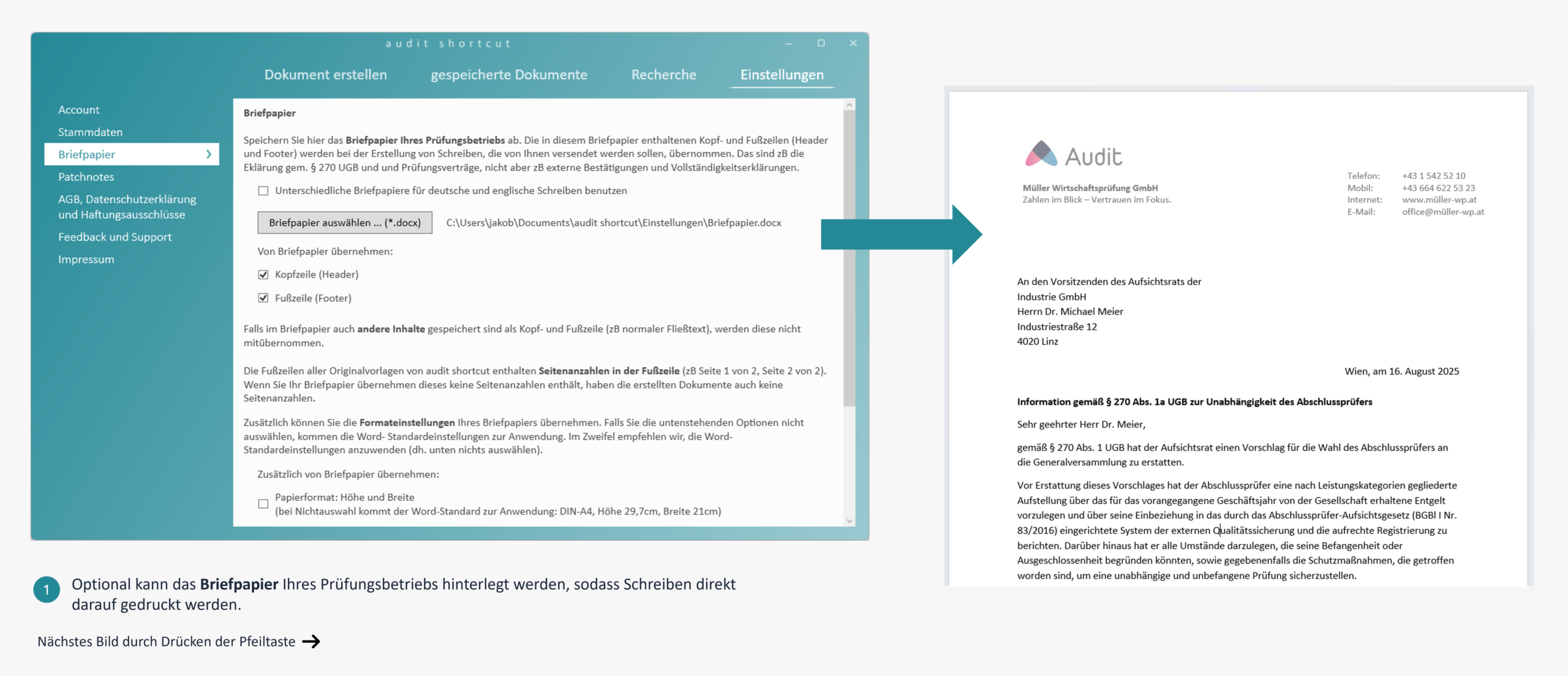 Zusätzlich können Sie Ihr Briefpapier hinterlegen, sodass Briefe und Verträge im Design Ihrer Kanzlei erstellt werden und sofort versandbereit sind. Das Briefpapier wird nur dort verwendet, wo es sinnvoll ist (z. B. beim Prüfungsvertrag und bei der Ausübung der Redepflicht, nicht jedoch bei der Vollständigkeitserklärung).
